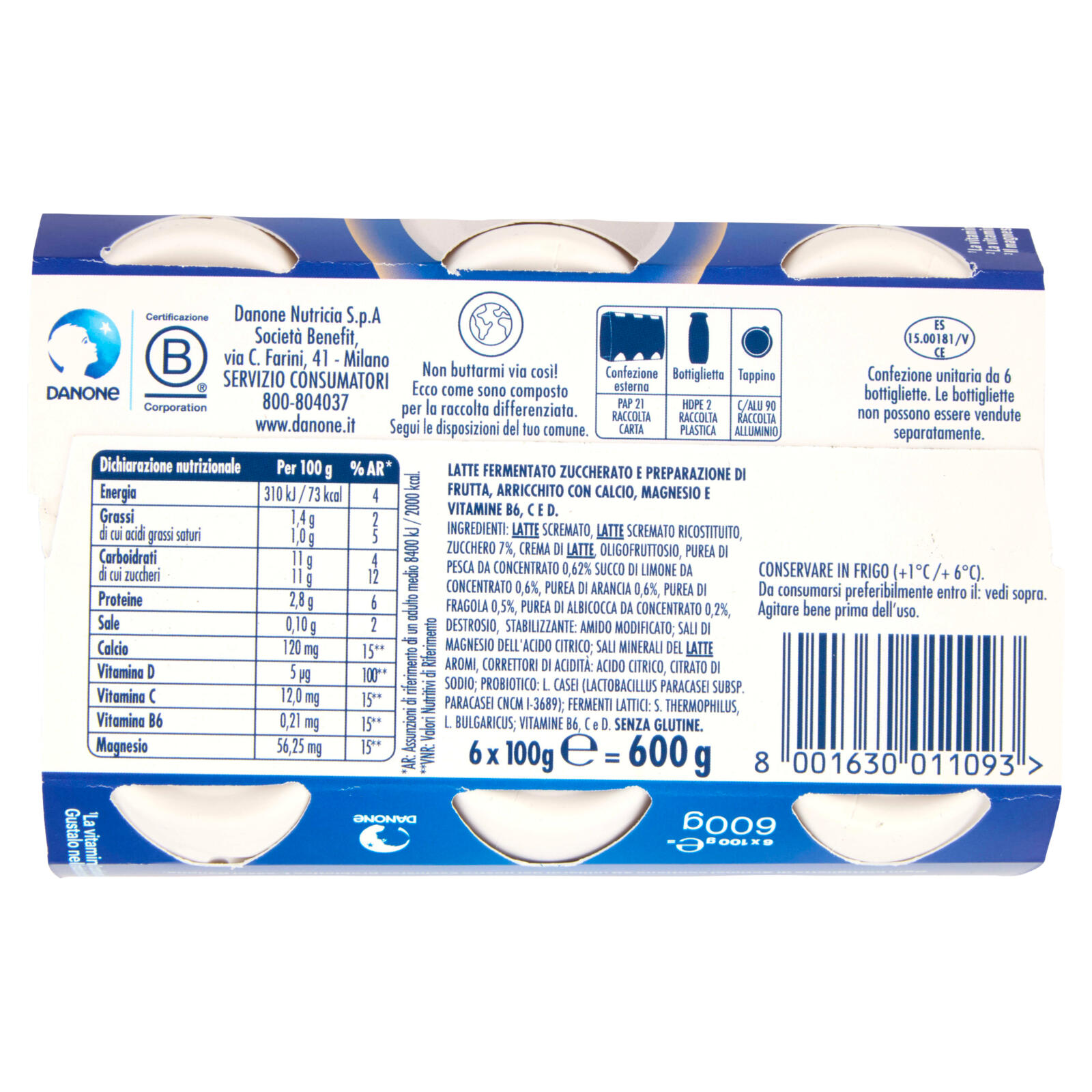 Latte fermentato zuccherato e preparazione di frutta, arricchito con calcio, magnesio e vitamine B6, C e D