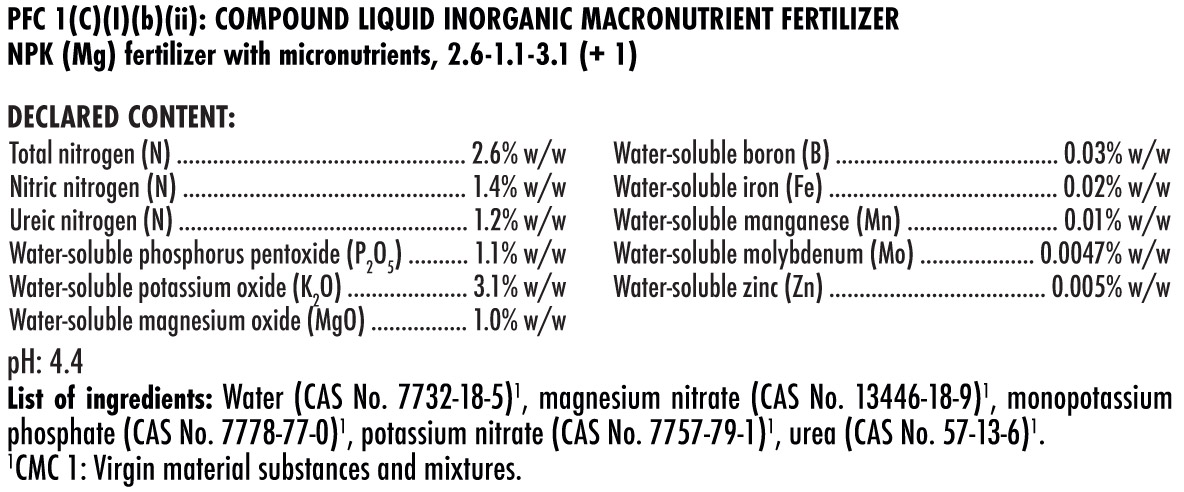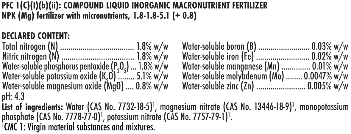 Usa tra 1 – 7ml/L dallo stadio di clonazione/semina fino al lavaggio finale. Aggiungi 2-4 volte/settimana secondo necessità. Per fibra di cocco o idroponica: usa quotidianamente (è richiesta un’integrazione di calcio aggiuntiva).