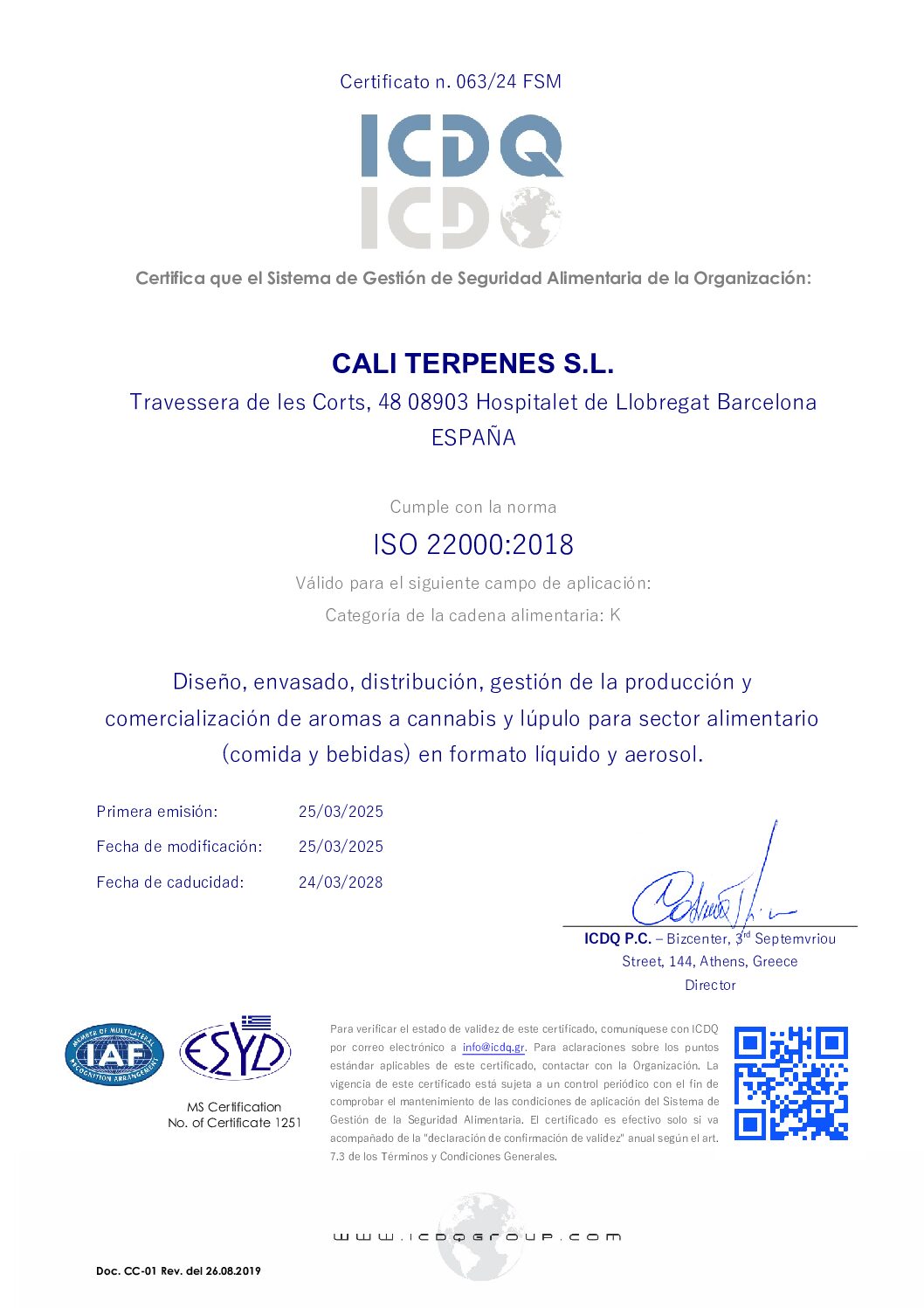 - Cali Terpenes produce e commercializza i suoi prodotti alimentari in conformità con la norma ISO 22000:2018 sulla sicurezza alimentare.