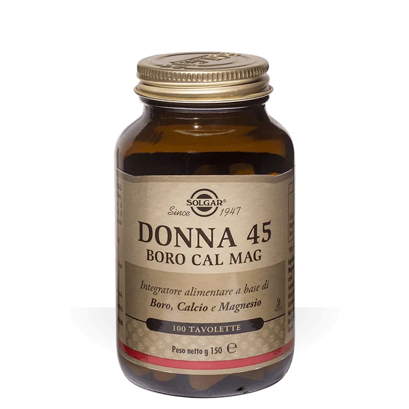 Dopo i 40 anni di età risulta particolarmente importante per la donna prendersi cura del proprio corpo sostenendolo con l’integrazione di minerali che favoriscono il benessere di questa nuova fase della vita. DONNA 45-BORO CAL MAG è un integratore alimentare a base di Calcio, Magnesio e Boro. Il Calcio ed il Magnesio sono minerali utili per mantenere la salute di ossa e denti. Il magnesio inoltre contribuisce al normale funzionamento del sistema nervoso, alla normale funzione psicologica e alla riduzione della stanchezza e dell’affaticamento.