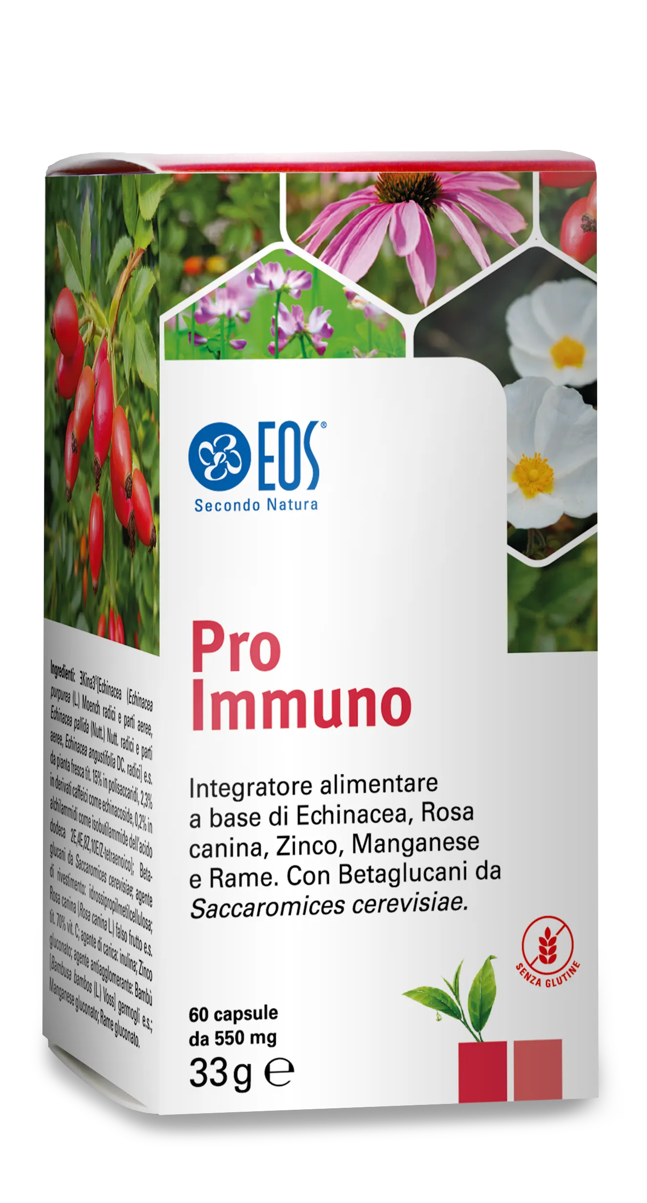 Eos Pro Immuno 60 capsule è un integratore alimentare a base di Ǝkina3®, estratto secco standardizzato di Echinacea Purpurea, Angustifolia e Pallida per favorire le naturali difese dell’organismo, Rosa canina con azione di sostegno, ricostituente, fonte naturale di Vitamina C.