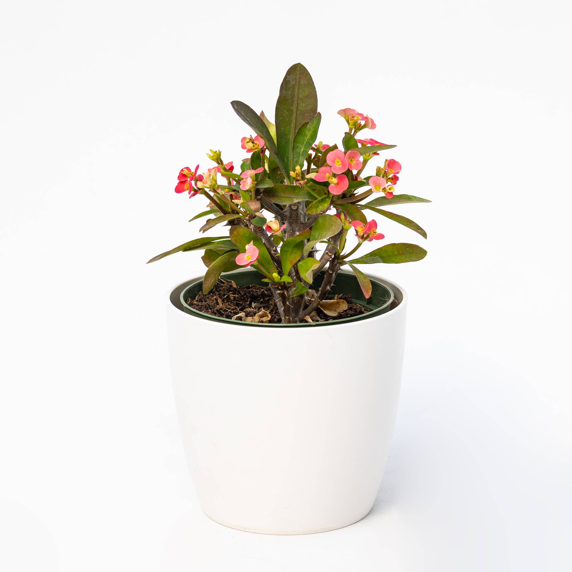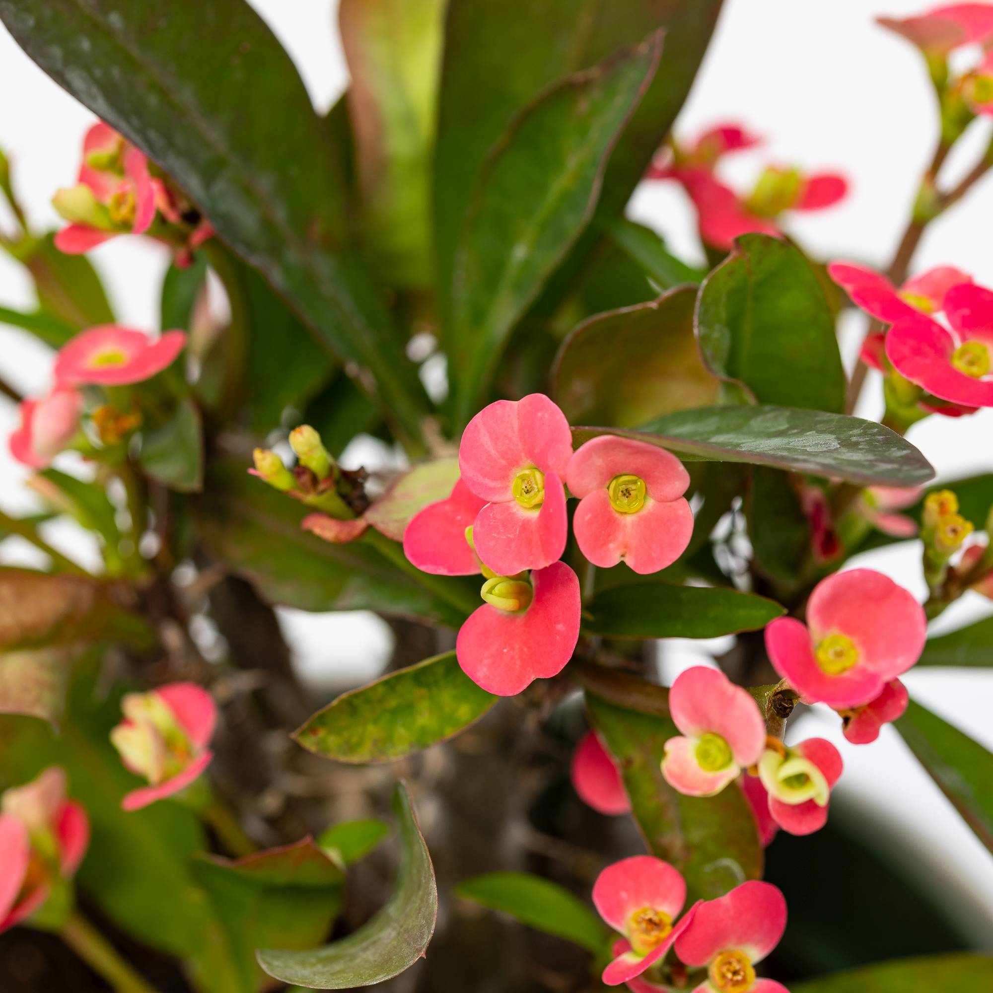 La pianta di Euphorbia milii “Dark Pink” è una semisucculenta appartenente alla famiglia delle Euphorbiaceae, originaria delle Isole Mauritius e Madagascar. La pianta è molto apprezzata per la sua resistenza e il suo portamento ornamentale. I suoi fiori, di un vivace rosa scuro, sono piccoli ma numerosi e appaiono in abbondanza durante la stagione primaverile ed estiva. Sviluppa steli spinosi e rami verdi succulenti, decorati da foglie ovate, coriacee e di un intenso colore verde. L’esposizione luminosa preferita dalla Euphorbia milii “Dark Pink” è una posizione soleggiata, ma può adattarsi anche a semiombra. Questo la rende ideale per la coltivazione sia all’interno che all’esterno, purché sia esposta a sufficiente luce. Per quanto riguarda il terreno, la pianta predilige suoli ben drenati, leggeri e sabbiosi, consigliato il terriccio per cactus e piante grasse, oppure il terriccio One plus. Per quanto riguarda le bagnature, è fondamentale evitare ristagni d’acqua, che potrebbero causare marciumi radicali. Una volta che il terreno si asciuga, è bene annaffiare abbondantemente, ma lasciando asciugare completamente tra un’irrigazione e l’altra. La Euphorbia milii è una pianta molto resistente alla siccità, ma non ama essere bagnata costantemente. Le temperature ideali di crescita sono tra i 18°C e i 24°C, ma può tollerare anche temperature superiori, sebbene non sia adatta a climi molto freddi. La temperatura minima tollerata è compresa tra 10°C e 15°C. La pianta è sensibile alle temperature troppo basse, per cui è meglio proteggerla in caso di gelate, mantenendola in ambienti più caldi durante i mesi invernali. A maturità, la pianta può raggiungere un’altezza di circa 60-90 cm e una larghezza di 60 cm, rendendola ideale per piccoli giardini, terrazzi o come pianta da interno. Per favorire la crescita e la fioritura, si consiglia di fertilizzare la pianta con un concime liquido per piante grasse una volta al mese durante la stagione di crescita (primavera-estate), oppure con un concime a lenta cessione per piante verdi. Durante l’inverno, ridurre la fertilizzazione. I parassiti più frequenti della Euphorbia milii sono gli acari, le cocciniglie e gli afidi, che possono danneggiare la pianta. È consigliabile ispezionare regolarmente la pianta e intervenire con trattamenti specifici in caso di infestazioni. Inoltre, la pianta può essere facilmente moltiplicata per talea, prelevando i rametti apicali e lasciandoli asciugare per qualche giorno prima di piantarli in un substrato ben drenato. La Euphorbia milii “Dark Pink” è perfetta per essere utilizzata sia in giardino che in appartamento. È ideale per bordure, aiuole, vasi da esterno o come pianta d’appartamento in un punto luminoso. Può essere abbinata a piante come il geranio, la lavanda o altre succulente per creare contrasto di colori e forme. Può anche essere utilizzata come pianta da siepe, grazie alla sua resistenza e al suo portamento.
