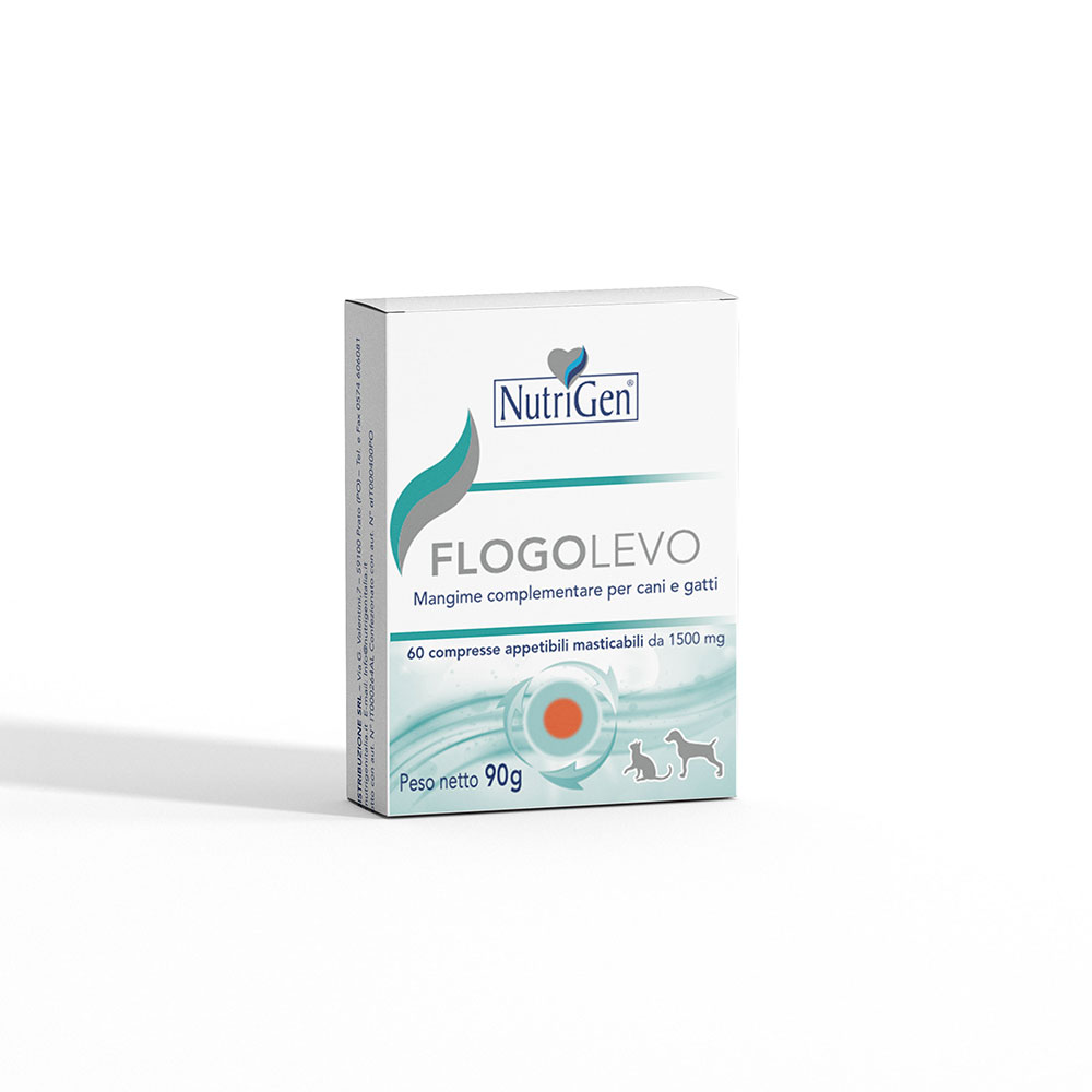 FLOGOLEVO è un mangime complementare per cani e gatti formulato in compresse appetibili con estratto di Curcuma in matrice fosfolipidica e Betacariofillene.