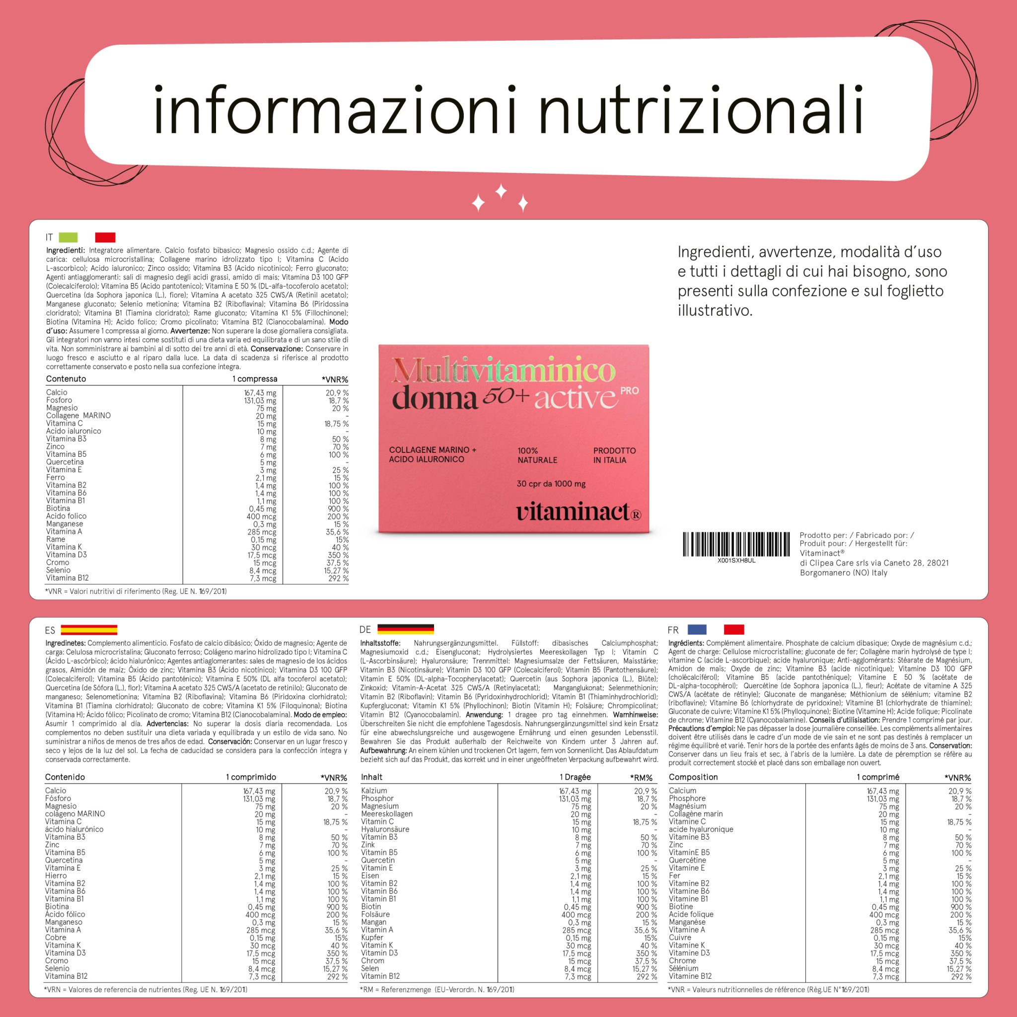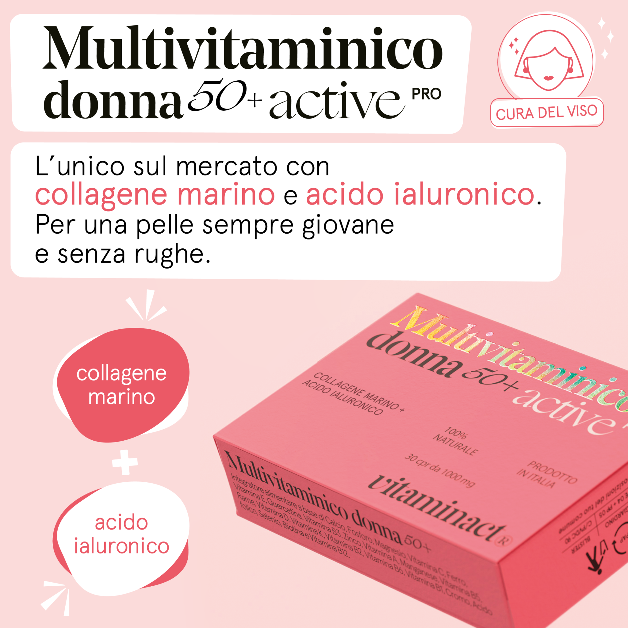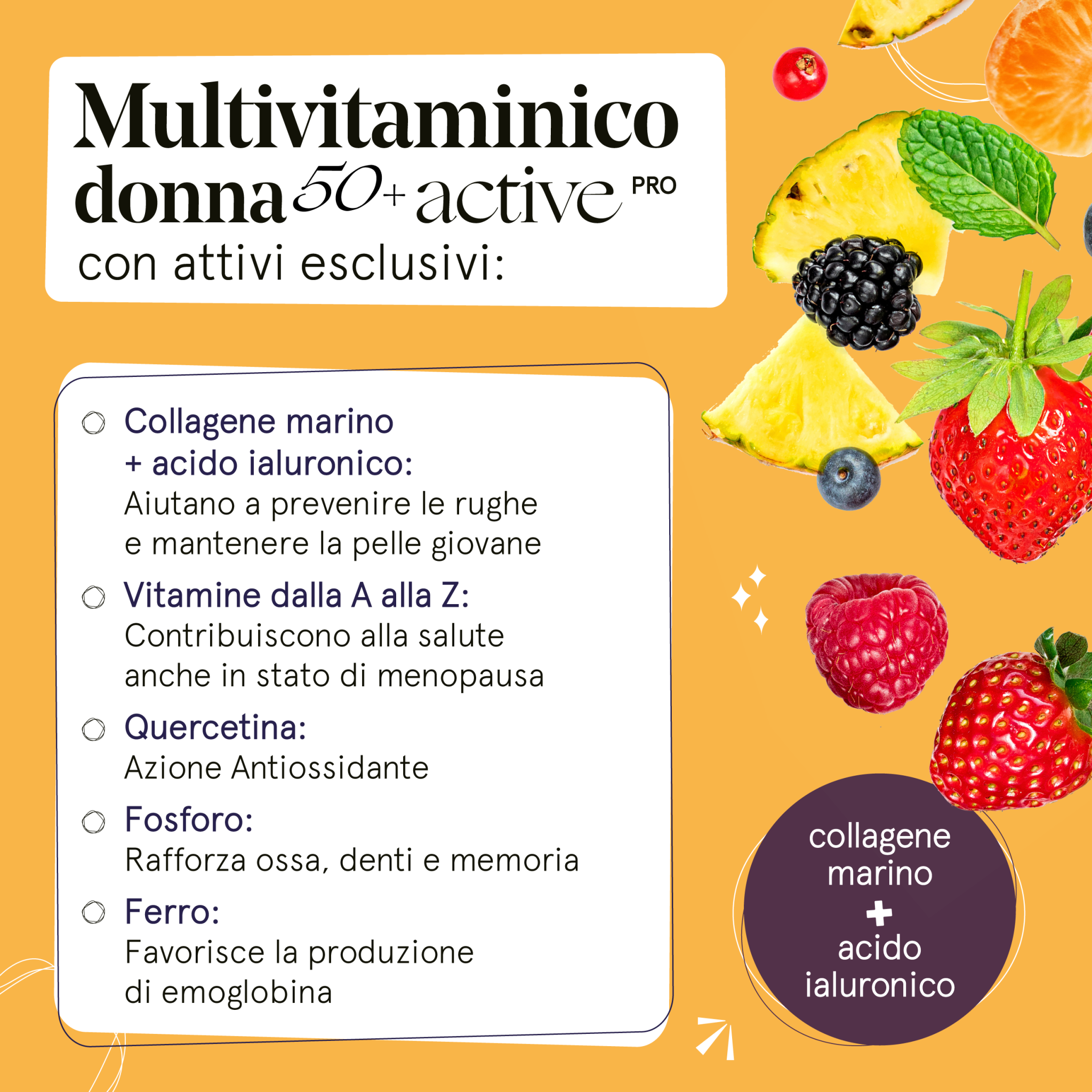 - ?L’UNICO SUL MERCATO A CONTENERE COLAGENE MARINO E ACIDO IALURONICO: Multivitaminico donna 50+ Active pro è unico nel suo genere poiché è l’unico sul mercato che offre la combinazione esclusiva di collagene marino e acido ialuronico, due ingredienti potenti noti per migliorare visibilmente la salute della pelle, prevenire le rughe, delle unghie e dei capelli.