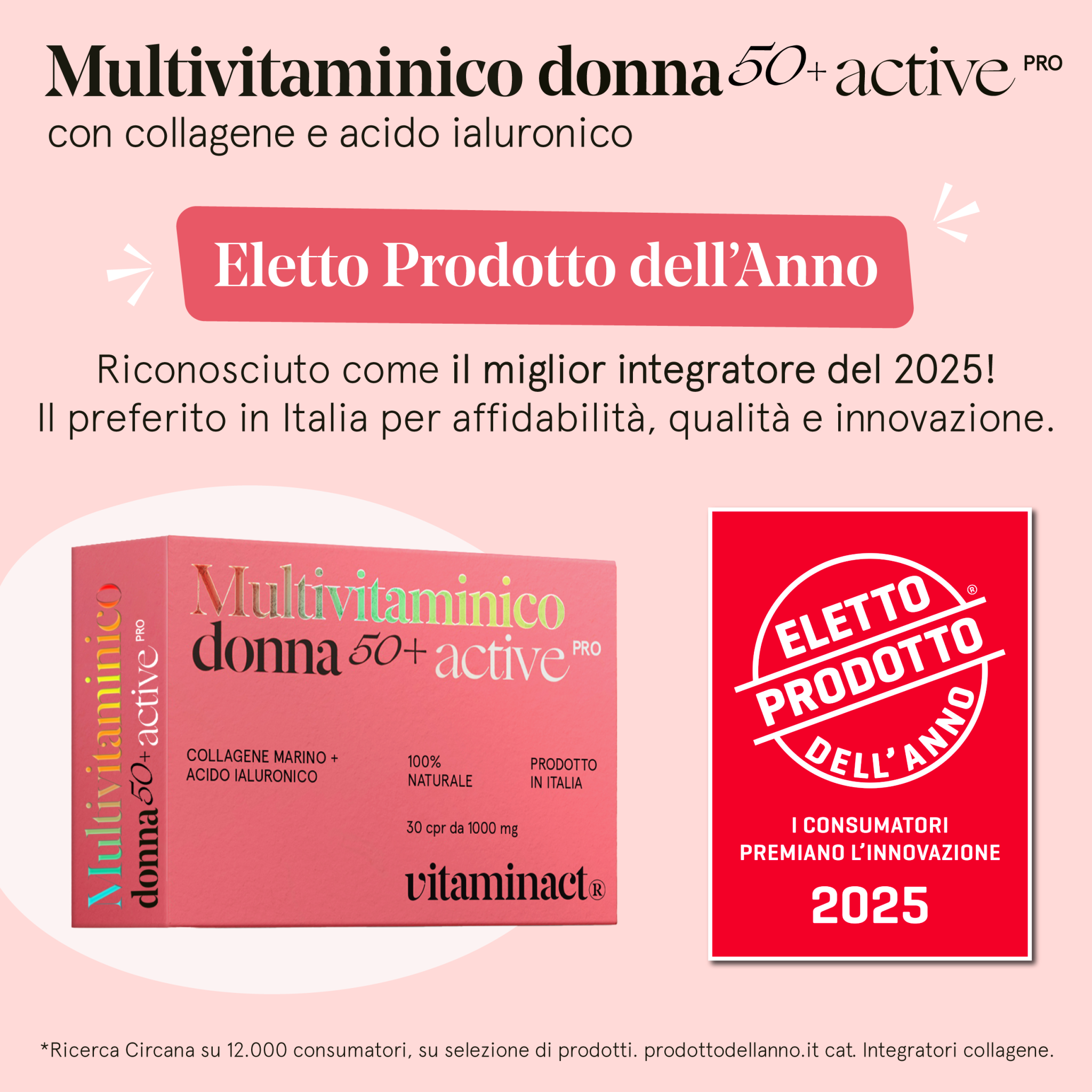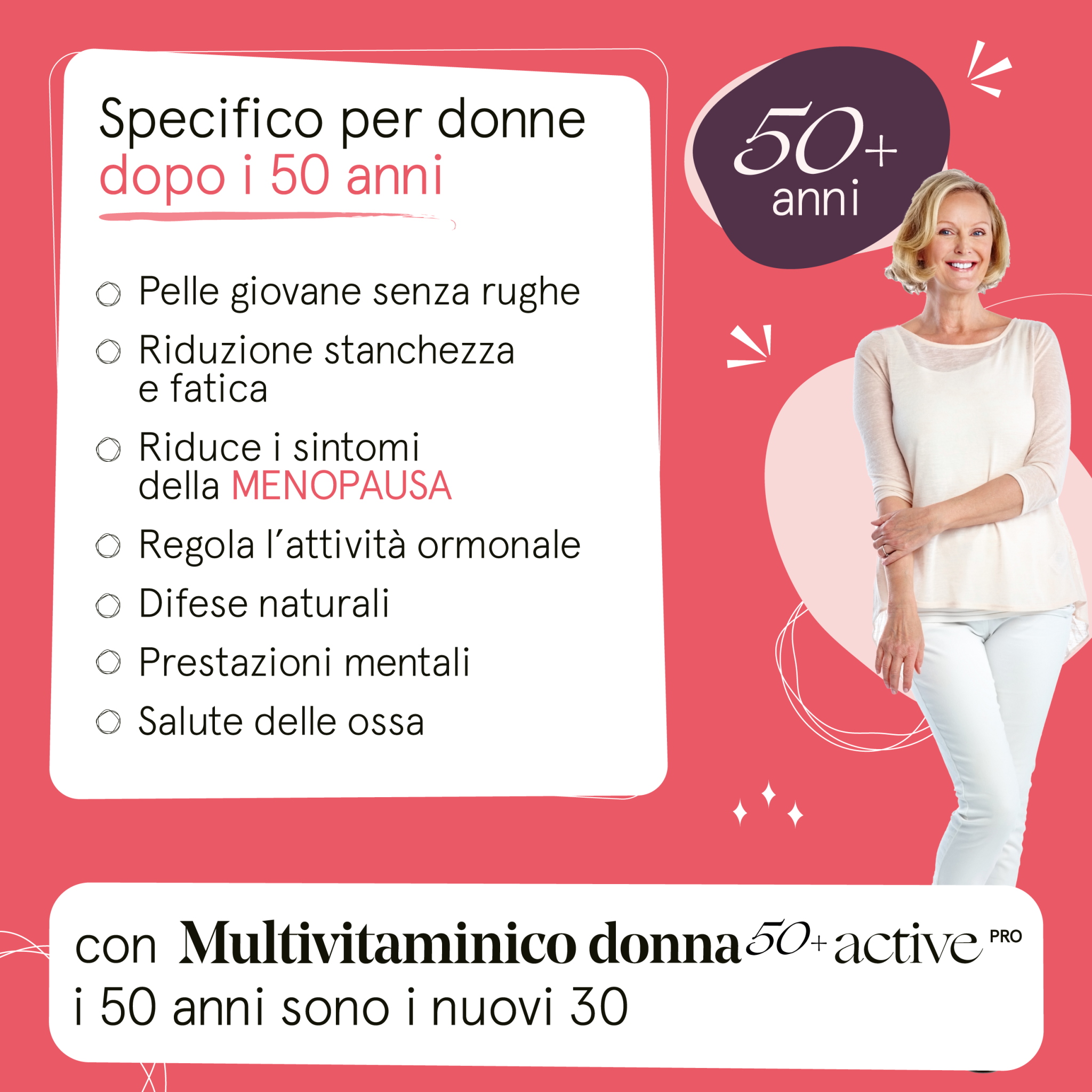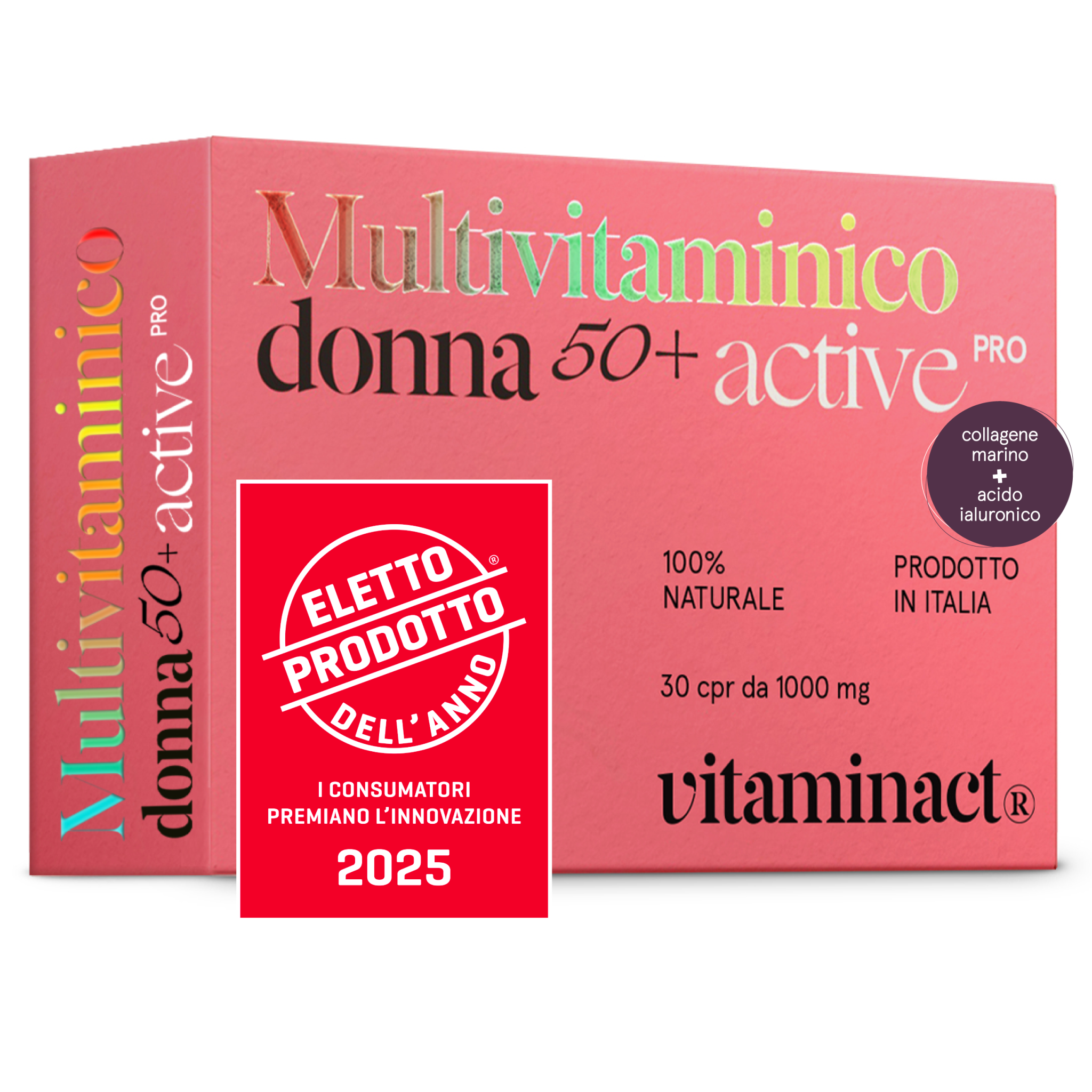 - ?L’UNICO SUL MERCATO A CONTENERE COLAGENE MARINO E ACIDO IALURONICO: Multivitaminico donna 50+ Active pro è unico nel suo genere poiché è l’unico sul mercato che offre la combinazione esclusiva di collagene marino e acido ialuronico, due ingredienti potenti noti per migliorare visibilmente la salute della pelle, prevenire le rughe, delle unghie e dei capelli.