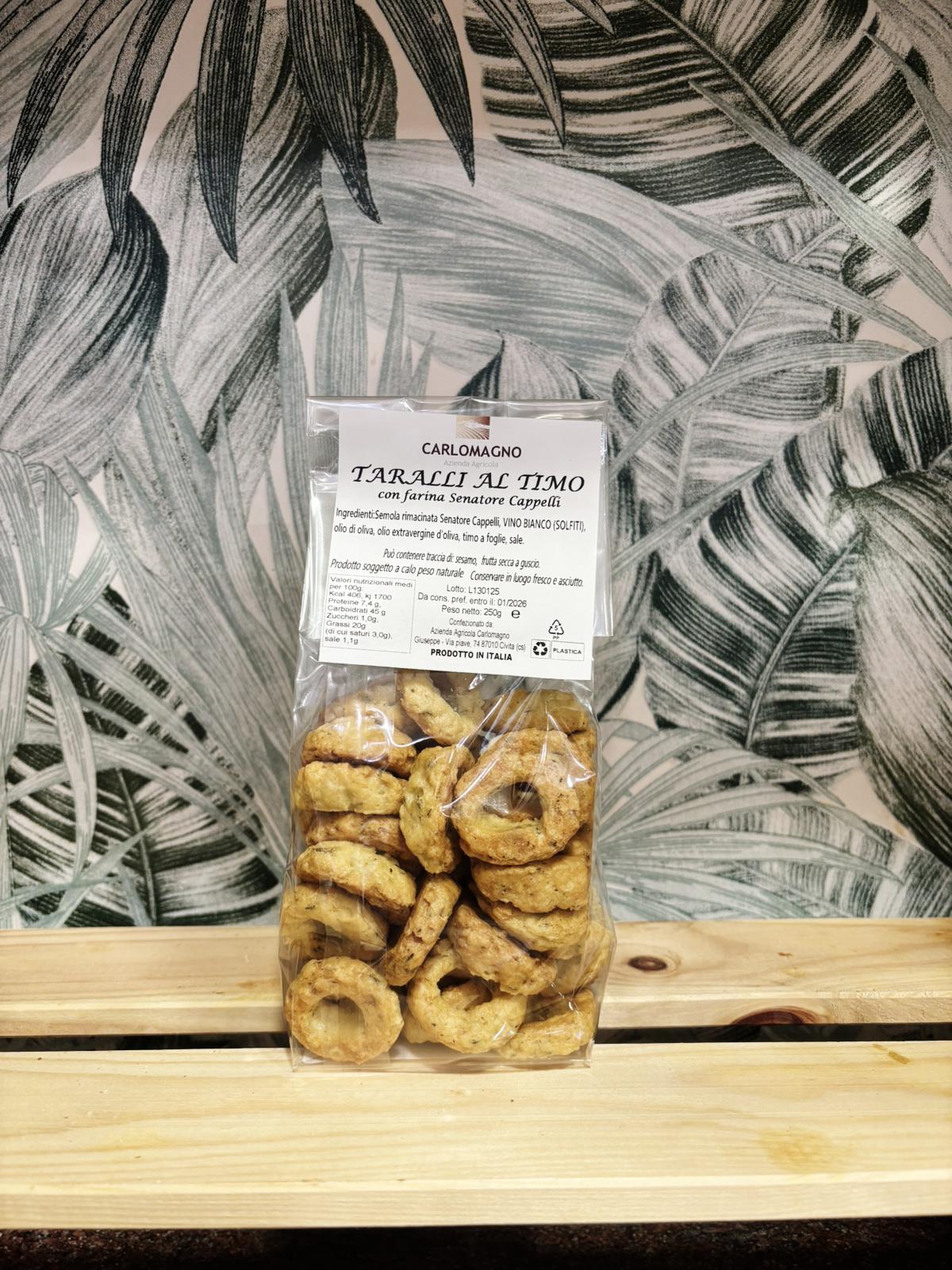 Ingredienti: Semola rimacinata Senatore Cappelli, Vino bianco (solfiti), olio d’oliva, olio extravergine d’oliva, sale, timo a foglie.