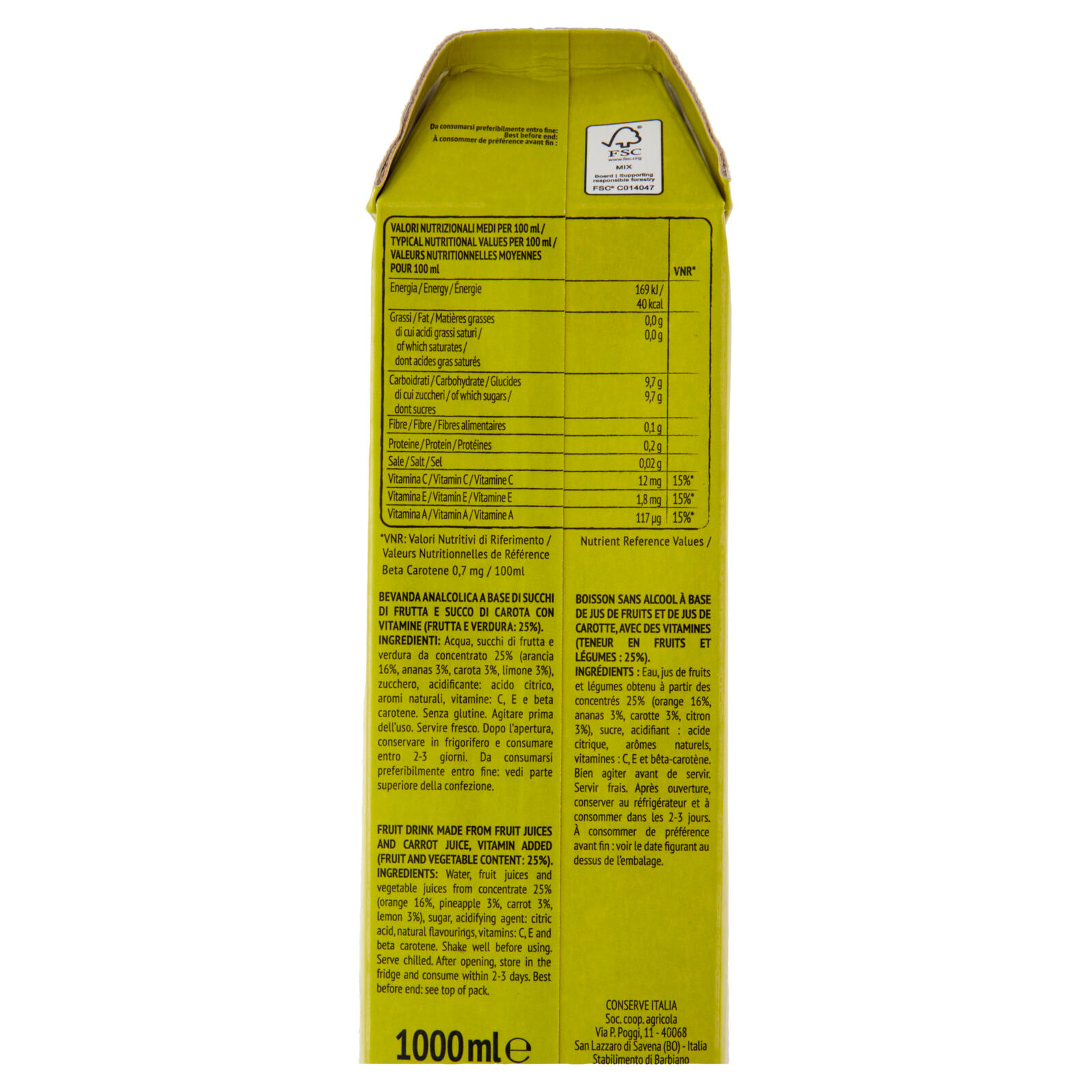Bevanda analcolica e base di succhi di frutta e succo di carota con vitamine (frutta e verdura: 25%)